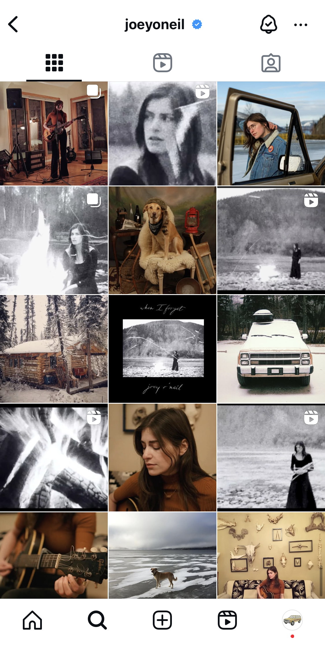 Joey O’Neil is a folk singer-songwriter based between the Yukon and Ontario. Her content reflects her lifestyle and the things that inspire her music: a woodland life in an off-grid cabin, cross-country road-trips, and her dog. Between lifestyle posts, she shares album releases, behind-the-scenes videos, music video teasers, and tour posters. Her brand is folkloric, nostalgic, and haunting in natural greens, blues, whites, and browns.
